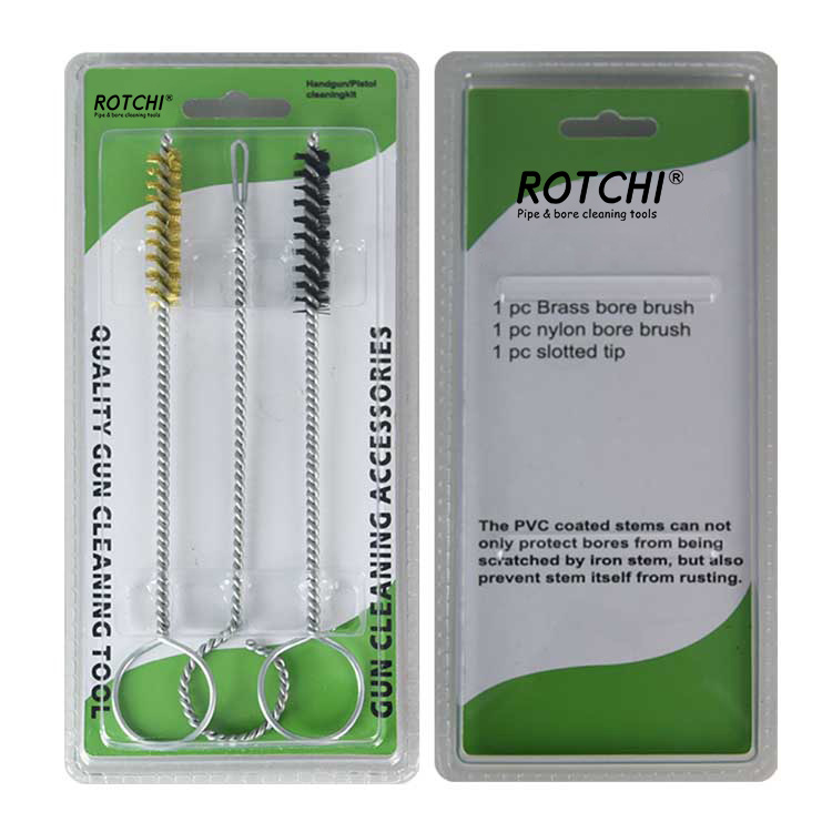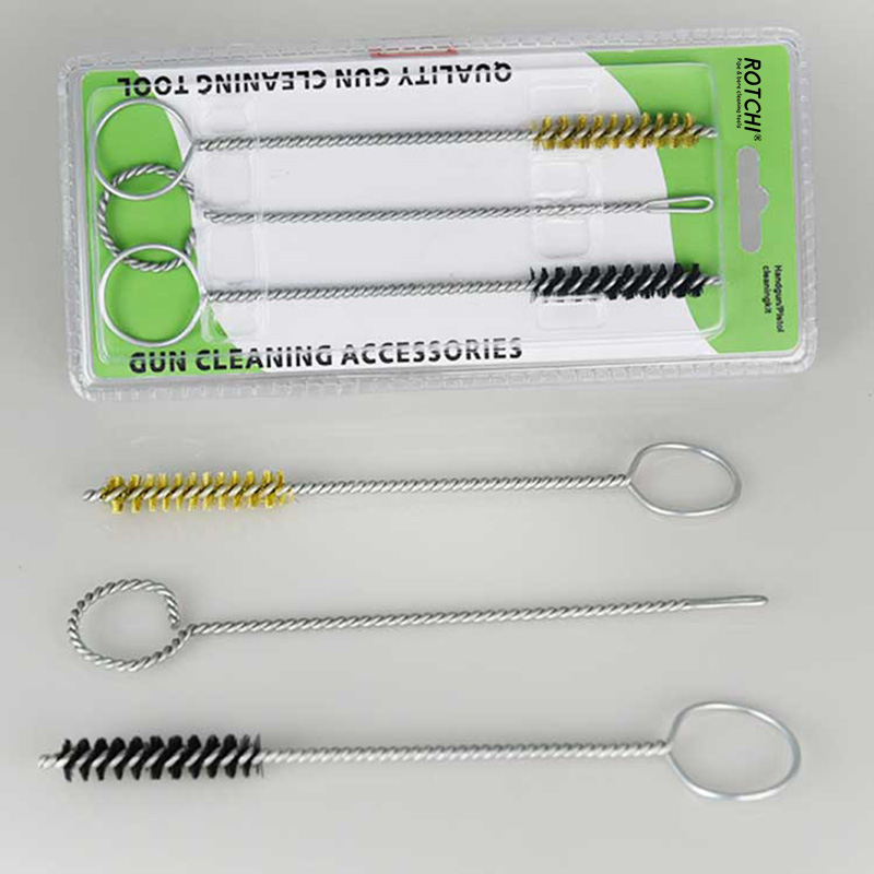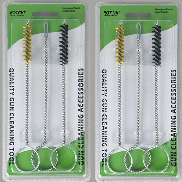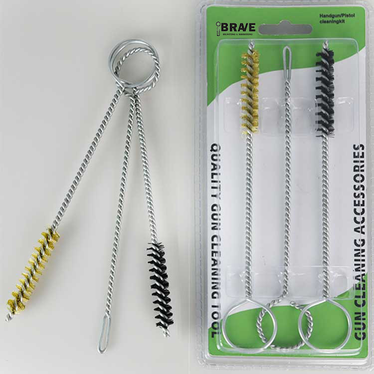 3 stk håndvåben rensesæt, pakket i dobbelt blister. En rengøringsbørste til messingboring, en rensebørste til nylonboring og en holder med slidser. Praktisk og effektiv.
