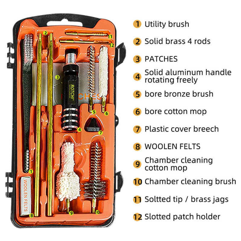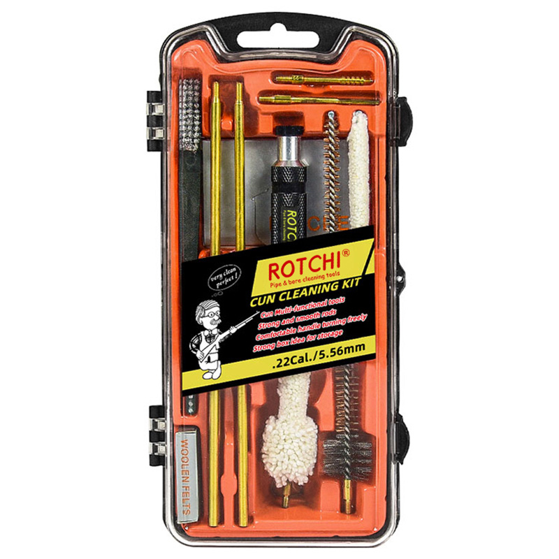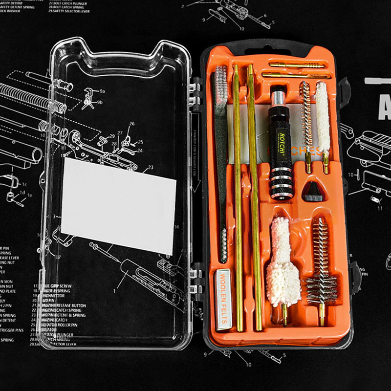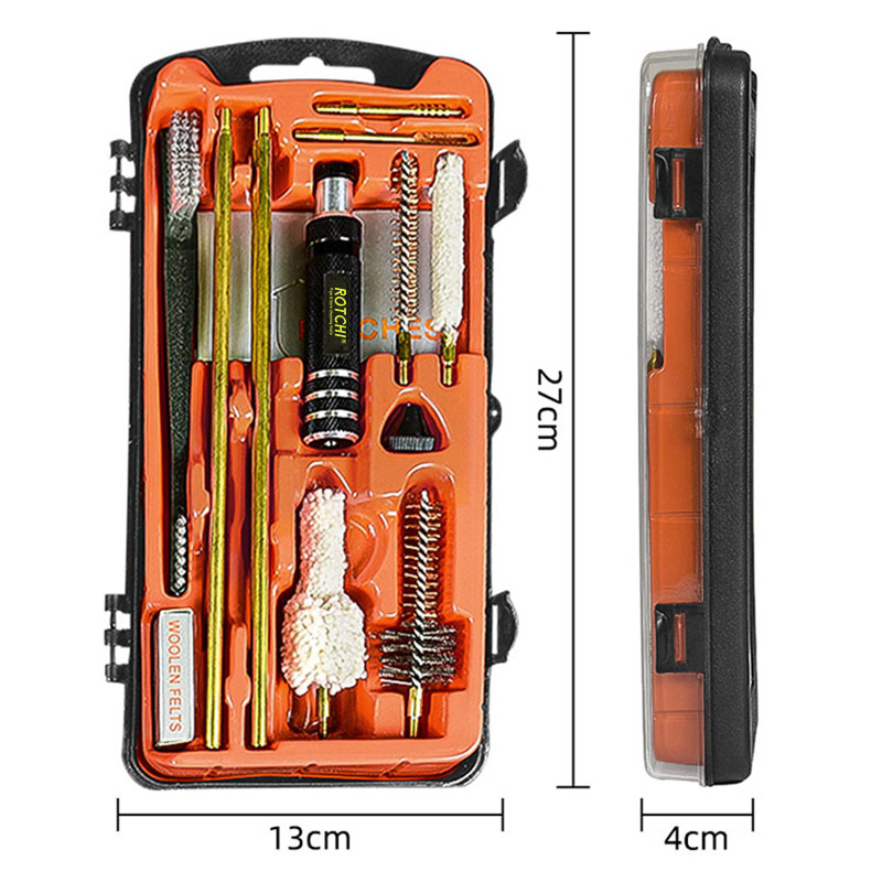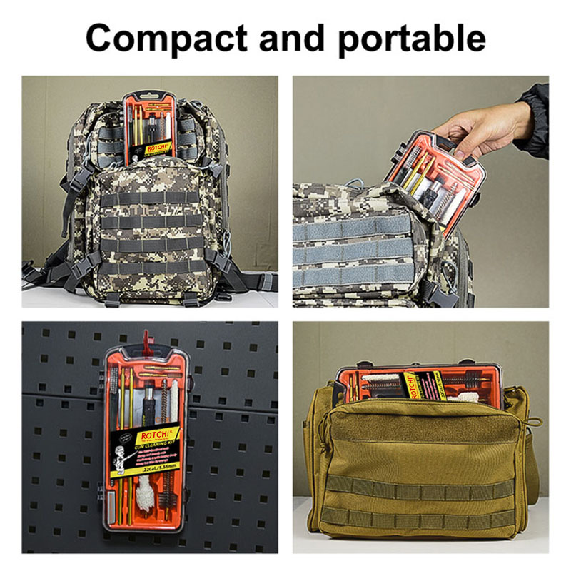 Det udendørs pistolrengøringssæt giver dig det fulde professionelle rengøringsværktøj til at møde forskellige pistolkalibre. Blisterbakker hjælper dig med at samle dem regelmæssigt. Den lille volumen og den stærke kuffert kan tillade dig at lægge dem i våbenetuier eller sækkeposer. Serien er uden olieflaske i.