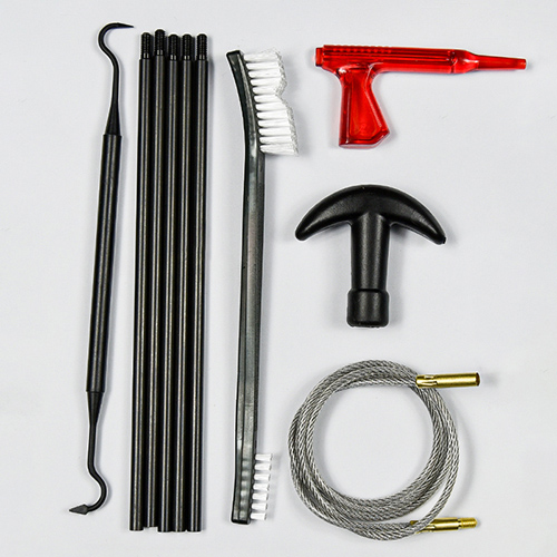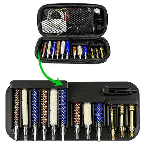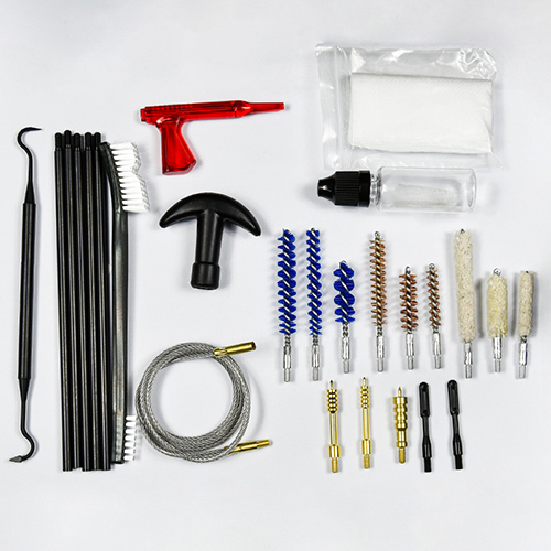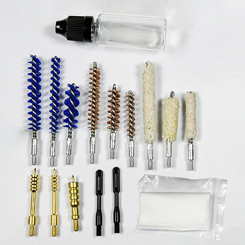 Rensesæt til riffel og håndvåben inkluderer 3 størrelser (.22cal. .30cal. 9mm). OX klud belagt PVC etui med lynlås. Messingbørster, bomuldsmopper, nylonbørster, messinghakker, 5 stænger 1 kalbe. Sand og sort farve til valg.