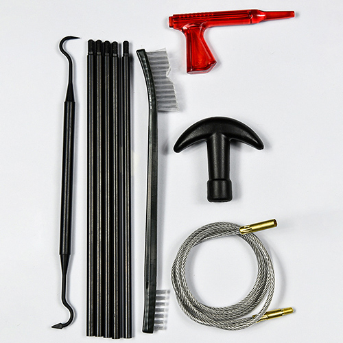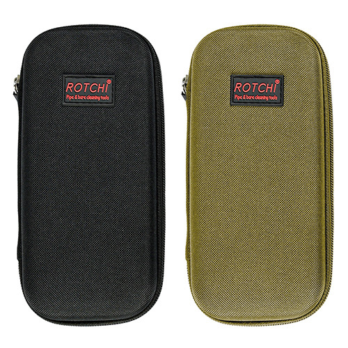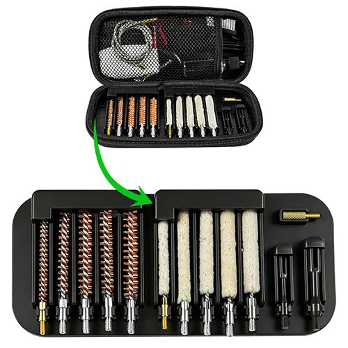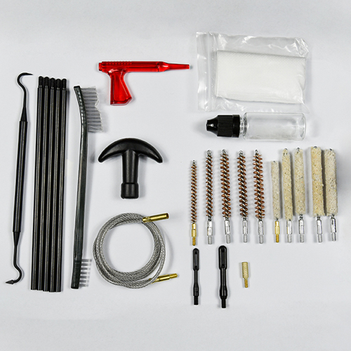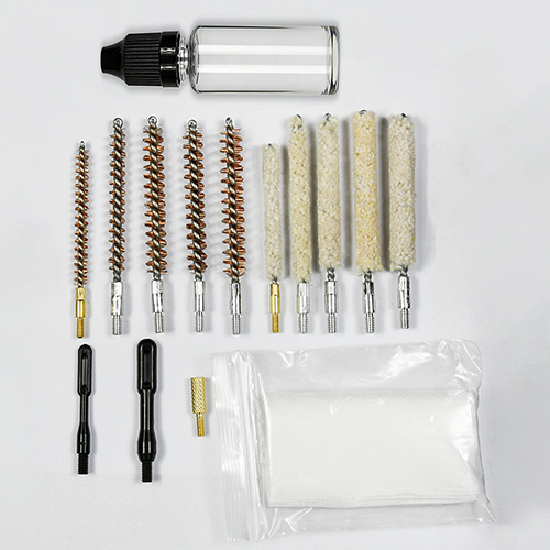 Riffelrensesæt indeholder 5 størrelser (.177, .22, .243, .27, .30 cal.), messingbørster og bomuldsmopper, 5 stænger, 2 calbes. Sand og sort farve til valg.