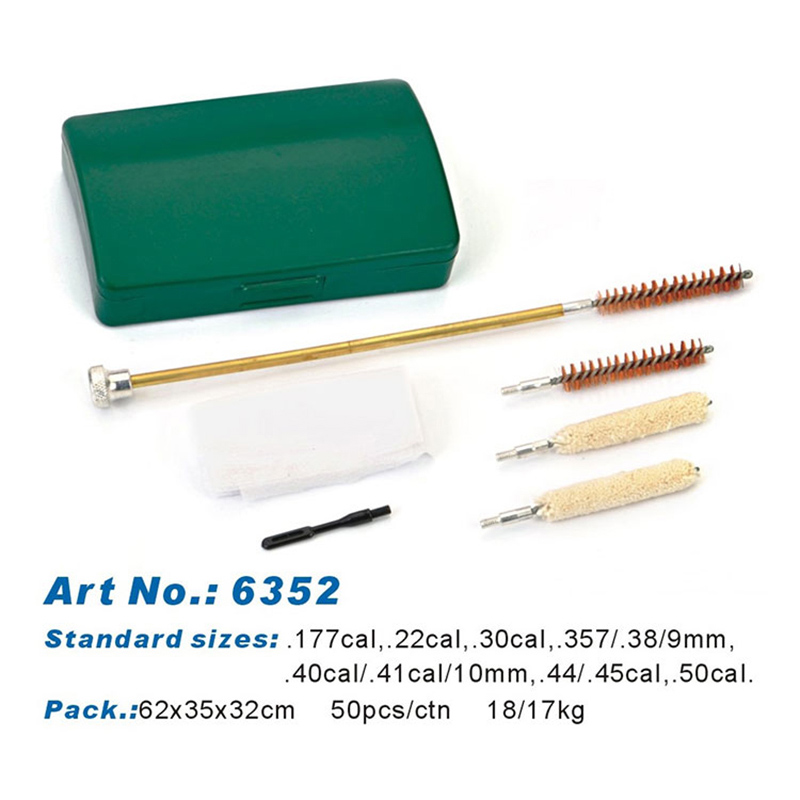 Håndvåbenrengøringssæt med buet plastkasse. Den buede plastkasse er anti-slide på bordet. 2 messingbørster og 2 bomuldsmopper. Hvis den ene er brugt op, kan du bruge den næste. Den er god til 9 mm pistolrengøring.